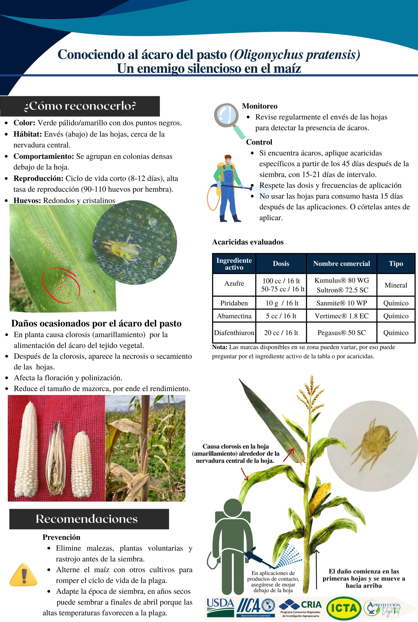 Puede afectar al maíz después de emerger su monitoreo recomendable es a los 40 dias después de siembra. Se puede visualizar pequeños grupos cubiertos por una tela de araña en el envés de la hoja. El daño que ocasiona se visualiza en la nervadura central con una necrosis amarilla. En casos de infestación alta el maíz no completa su ciclo por lo que no hay producción.